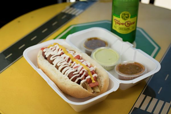 Two wienies wrapped in bacon with carne asada. Topped with whole pinto beans, grilled onions, tomato, mustard, and mayo on a baker’s bread bun
