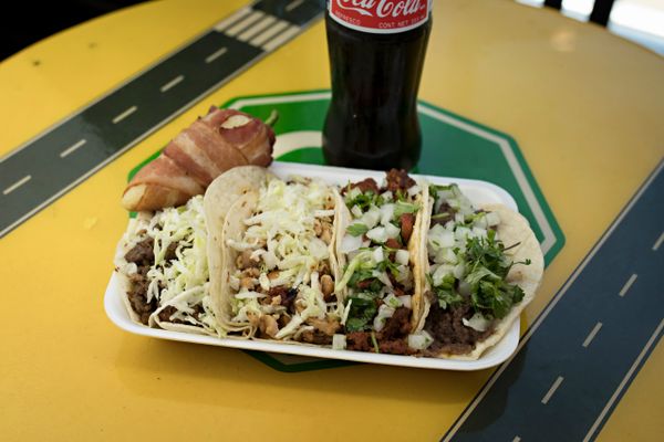 Chicken and Asada marinated 24hrs in orange juice and spices, grilled on a mesquite fire. Topped with cabbage on a homemade flour tortilla
