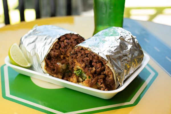Chicken and Asada marinated 24hrs in orange juice and spices, grilled on a mesquite fire. With refried beans, spanish rice, shredded cabbage and monterey jack cheese. Rolled in a 18inch flour tortilla
